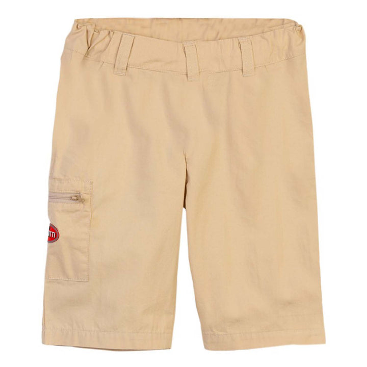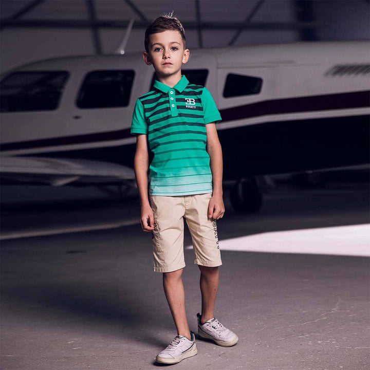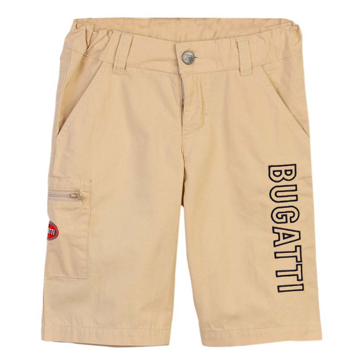 Younger boys Beige logo shorts by Bugatti Kids. Made from soft cotton, it features a logo badge on the front and logo tape on the side, it has a dual side pocket with black trims and an elasticated black waistband
