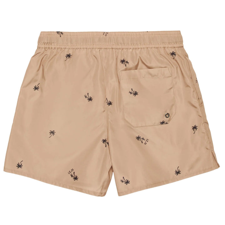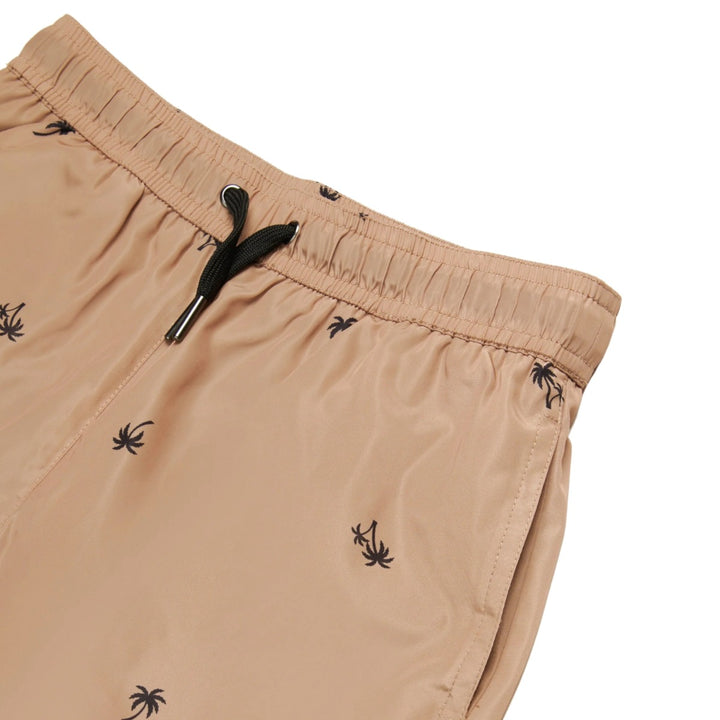 Nylon boxer swimsuit with all-over print Palms. Midi length. Drawstring waist. Mesh inner briefs. Front welt pockets and back pocket.