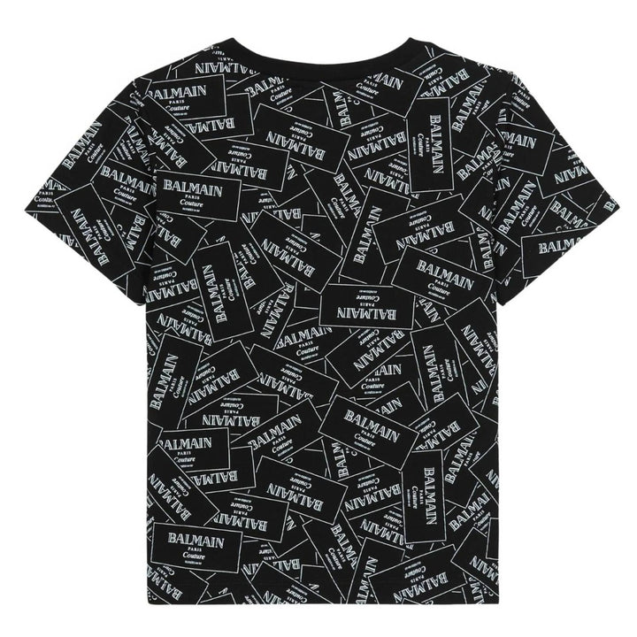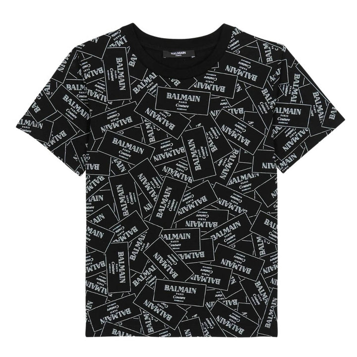 Elevate casual wear with this classic black T-shirt from Balmain Kids. Crafted from 100% cotton, it features a bold logo print across the chest, adding a signature designer touch. The round neck, short sleeves, and straight hem offer a timeless silhouette perfect for effortless, everyday style with a luxury edge.