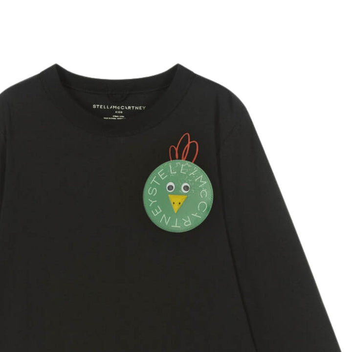 Boys black chicken logo t-shirt by Stella McCartney Kids features a playful farm-themed design. Crafted from soft organic cotton jersey, it offers comfort and style with a vibrant chicken logo on the chest. Perfect for autumn and winter wear, this sm