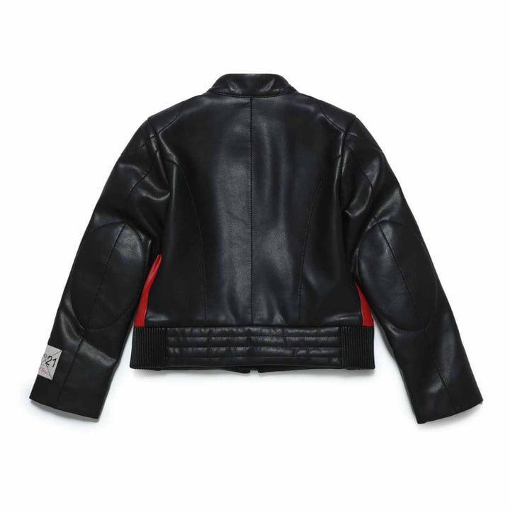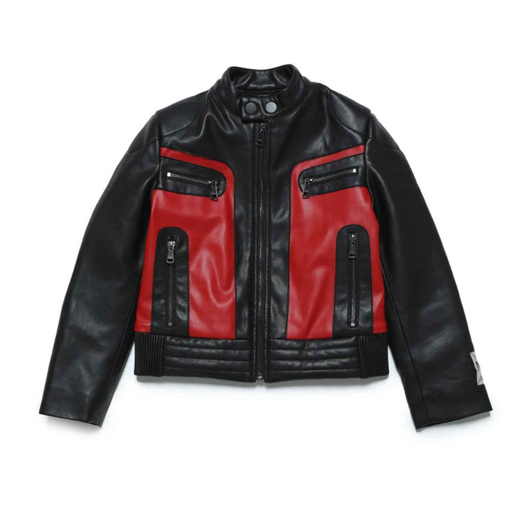 Long-sleeved, imitation leather biker jacket with colorblock details. Features a button closure on the collar, functional pockets and breast pockets, and a patch with logo on the cuff.A garment with a rock soul, where the colorblock effect enhances s