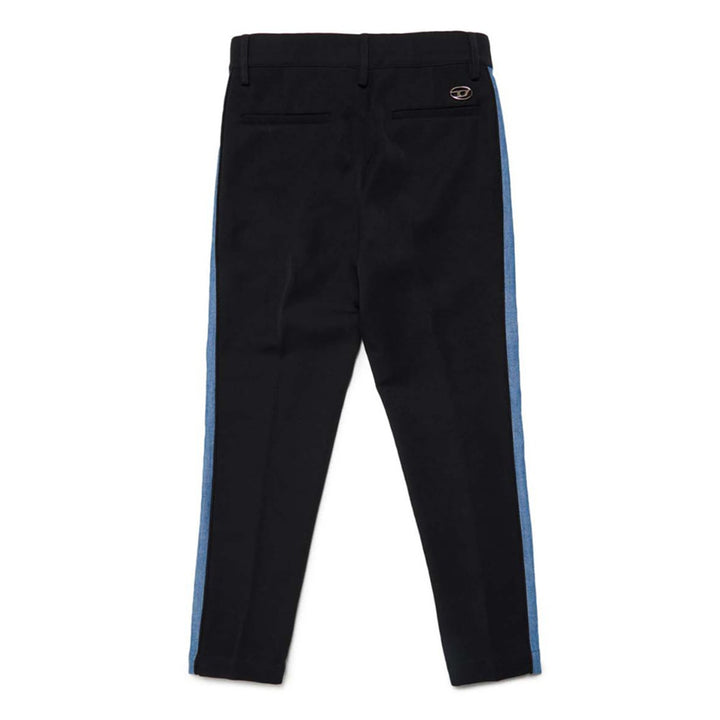 Elegant cool wool trousers with chambray side bands along the legs and zip and button fastening. At the waist there are belt loops and single button fastening. The garment is part of the Diesel Street Chic line, perfect for special occasions.