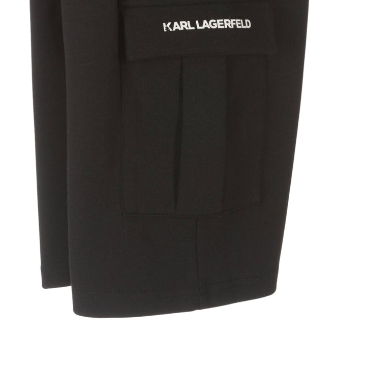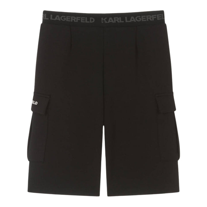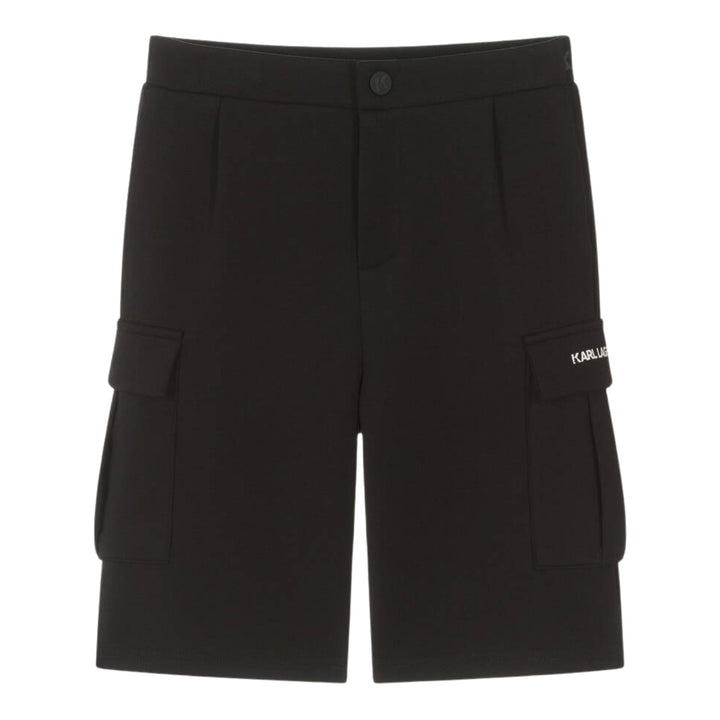 Black cargo shorts for boys by KARL LAGERFELD KIDS, made in soft cotton-blend double jersey. Comfortable to wear, these Bermuda length shorts have cargo pockets on each leg with a white logo printed on one. The waistband is elasticated at the back an