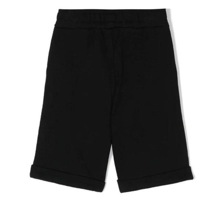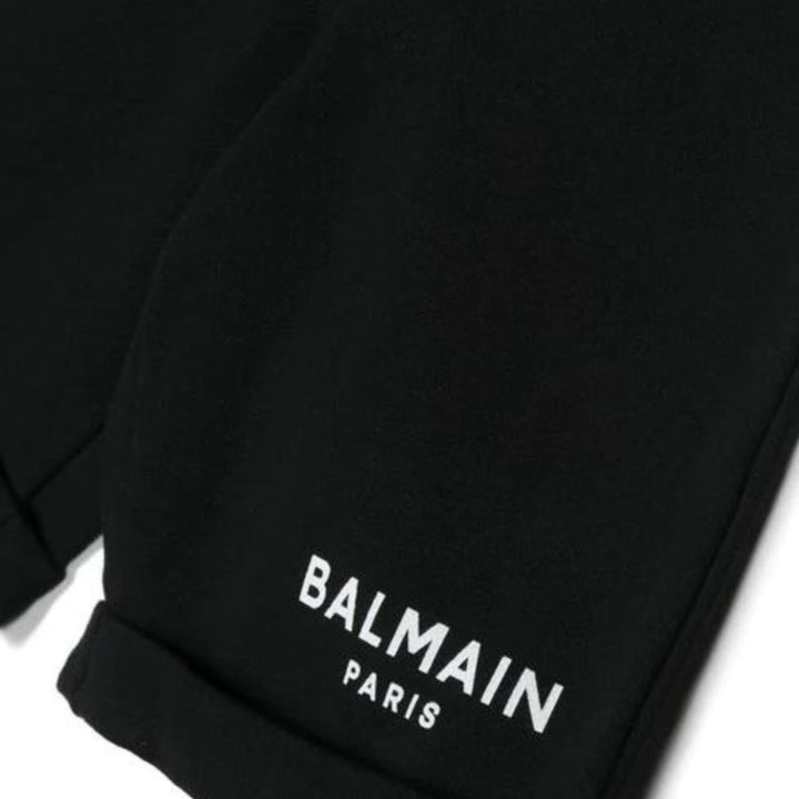 Casual black turned-up shorts for little boys, by luxury French designer Balmain. Made in super soft cotton jersey, these laidback bottoms have a recognisable white logo print on one leg and a stretchy, elasticated waist for comfort.