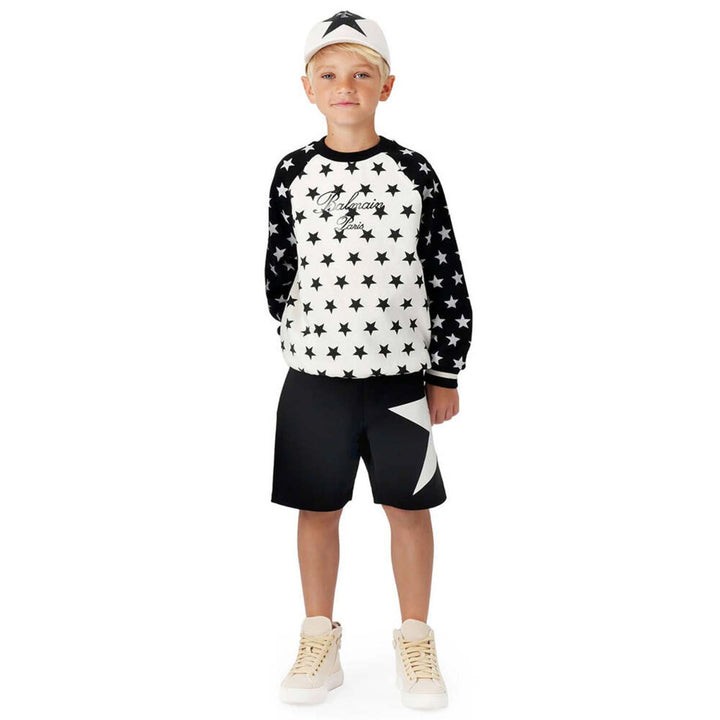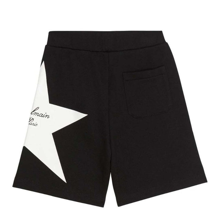 Black shorts for boys by luxury brand Balmain, made from soft mid-weight cotton jersey. Great for a laid-back and casual style, they are printed with a bold shiny ivory star on one leg with an italic Balmain Paris logo for an iconic finish. They are