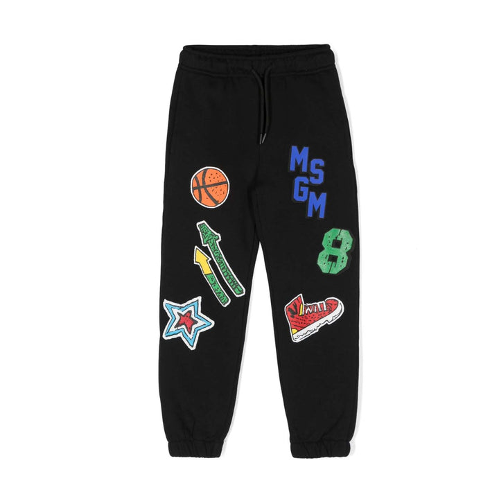 Black joggers for boys by Italian label MSGM. Inspired by collegiate fashion, these cool joggers have brightly coloured varsity-style logo artwork on the front. With an elasticated, drawstring waist, they are made from stretchy, mid-weight cotton fabric for comfortable wear. There are useful. concealed pockets on the side seams.