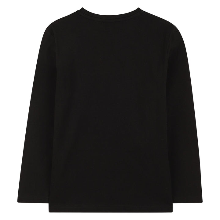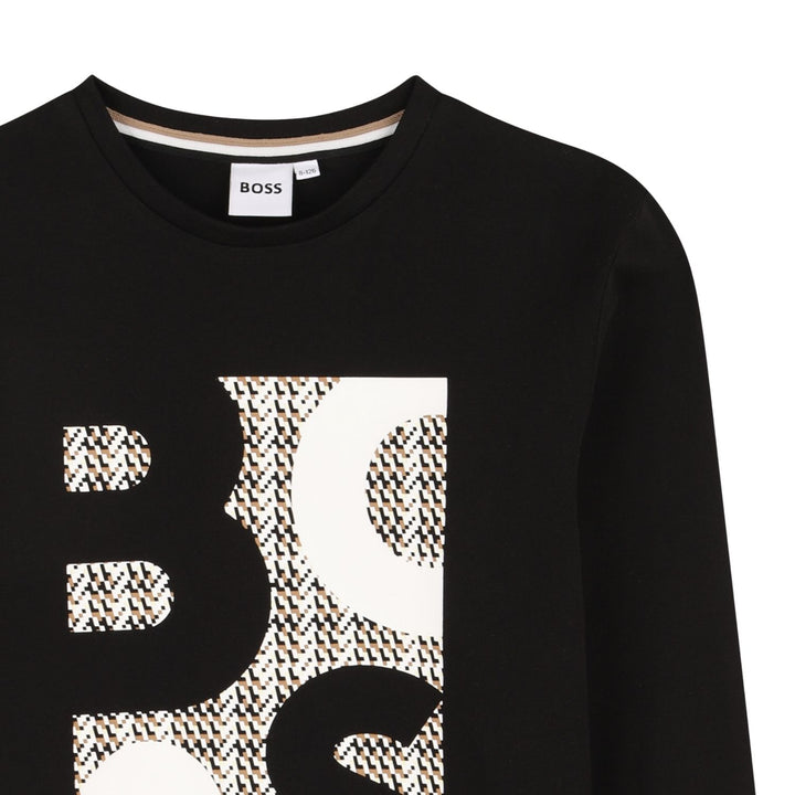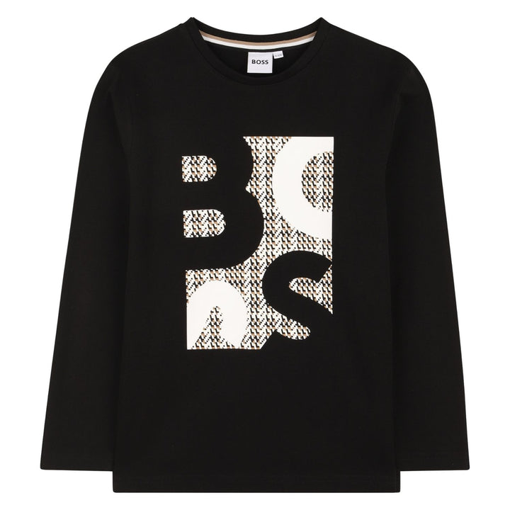 This is a stylish black long-sleeve t-shirt featuring a bold, abstract graphic design on the front that spells out BOSS. The print incorporates textured patterns within the white letters, giving the shirt a modern and fashionable look. The top has a classic crew neckline and is likely made from comfortable, high-quality fabric suitable for casual or smart-casual wear.