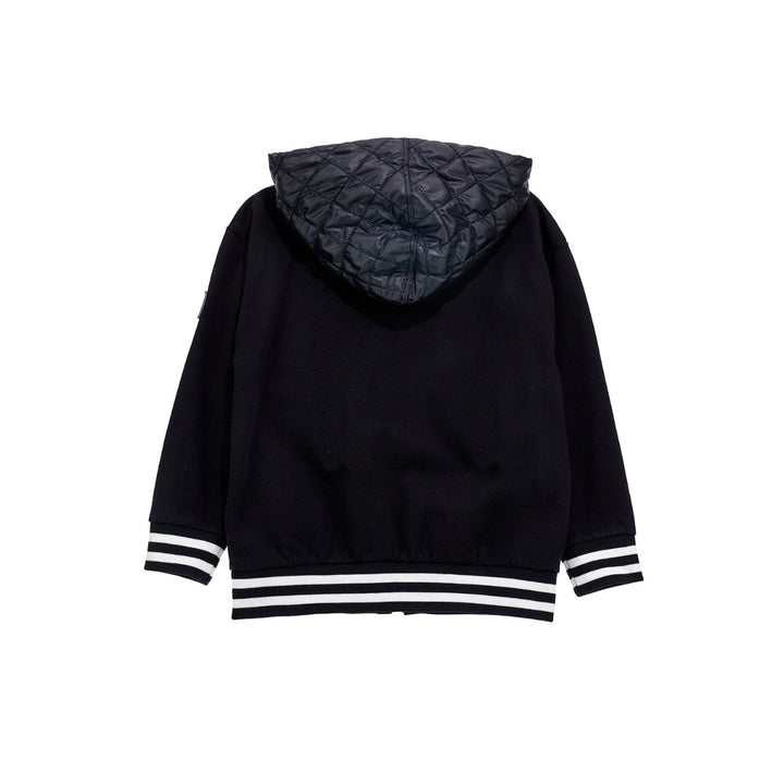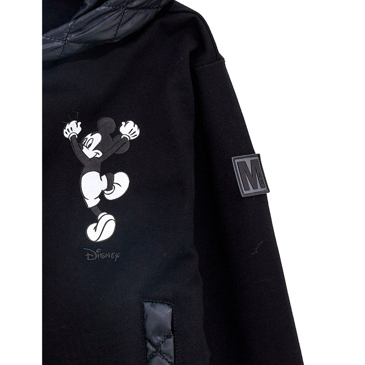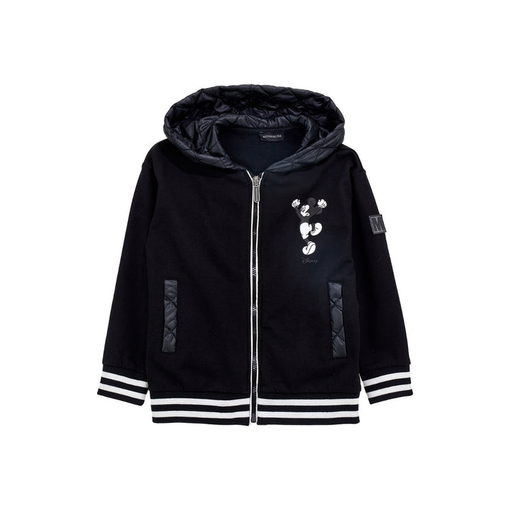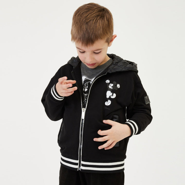 Boys playful black zip-up hooded top by Italian brand Monnalisa, made in mid-weight cotton jersey, with silky trims quilted trims. It has white striped varsity style trims and a whimsical Mickey Mouse print on the front with the Disney logo beneath.