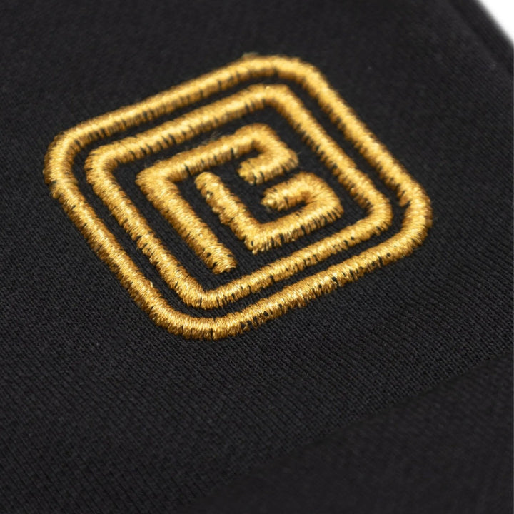 Black shorts with an embroidered logo, elasticated waistband, two side inset pockets, and a rear patch pocket.