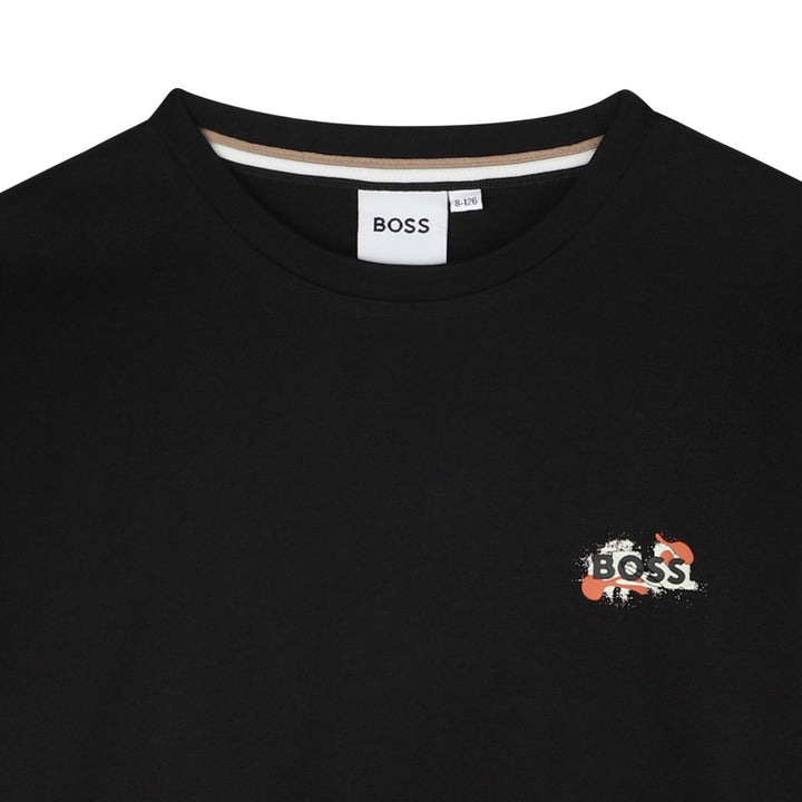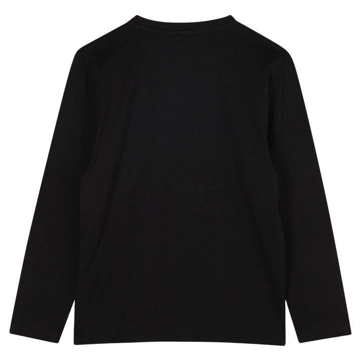 This black long sleeve T-shirt from BOSS features a small, colorful embroidered logo design on the left chest, adding a subtle pop of detail to the minimalist look. Made from soft, comfortable fabric, it offers a versatile piece suitable for casual wear with a modern and refined touch. The crew neck and clean lines make it a wardrobe staple for everyday styling.