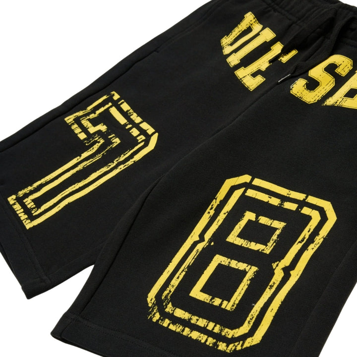 Short fleece pants with drawstring waist. Boxy fit. Flocked Diesel 78 college-style graphic on the front. Front welt pockets and back breast pocket.