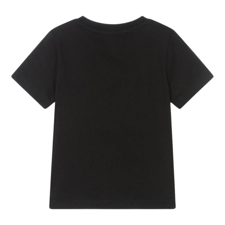 Black cotton T-shirt for boys by American designer, DKNY. Made in comfortable jersey, this casual short-sleeved top features a graduated logo graphic in shades of green and neon orange.