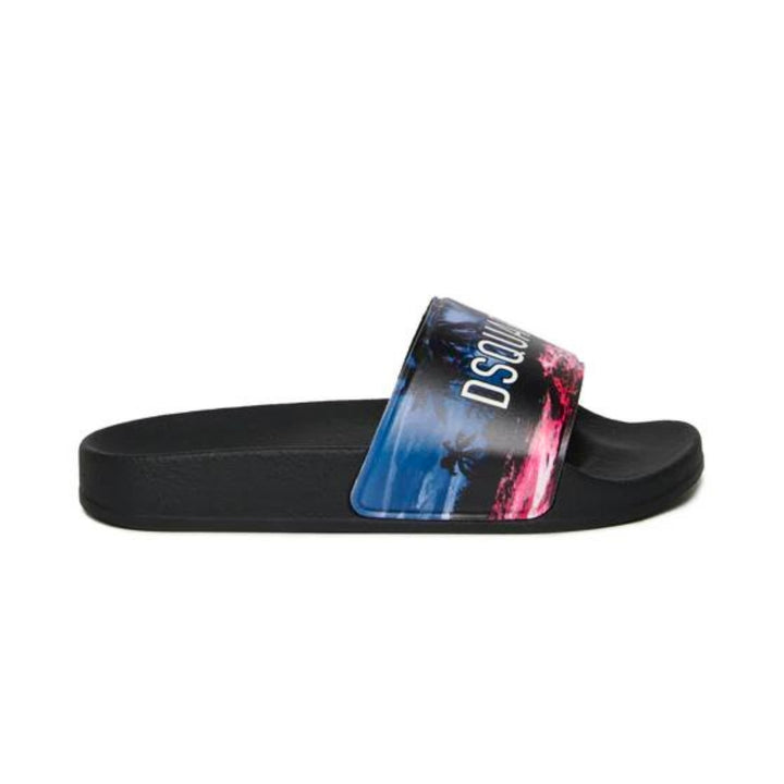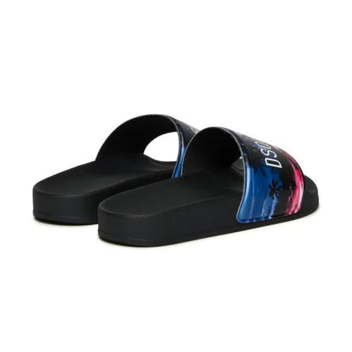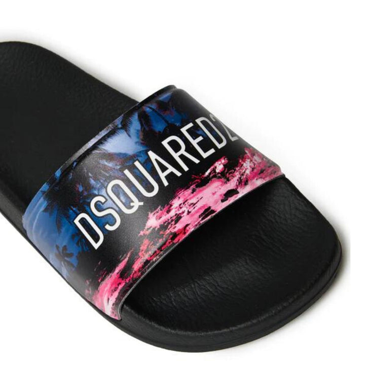 Slide slippers feature a PVC upper and rubber sole. They feature a palm graphic and Dsquared2 logo printed in a contrasting color on the upper.