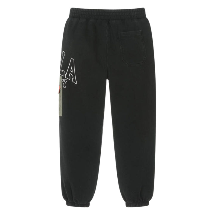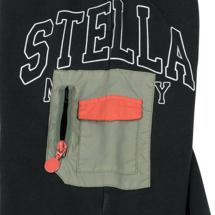 Black joggers for boys by Stella McCartney Kids, made in soft, mid-weight cotton jersey. Comfortable and versatile, they feature a multi-function pocket on the knee along with the designers varsity-style logo print.