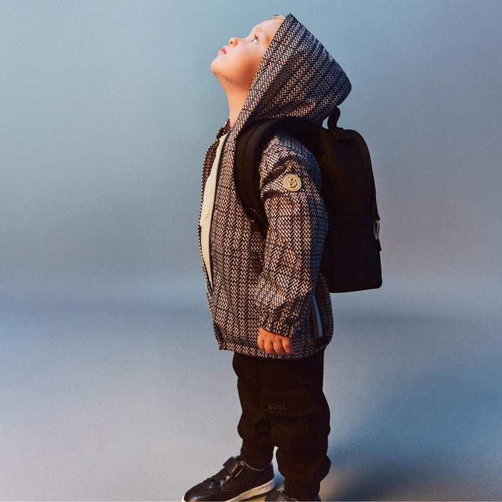 Black backpack for boys and girls by BOSS. Made from faux leather trims, this practical bag has a main compartment with a silky lining and a zip fastening on top. It also has zip pockets on the front and a white logo print. The back and adjustable shoulder straps are padded with soft mesh for comfort, and there’s a handy carry handle on the top.