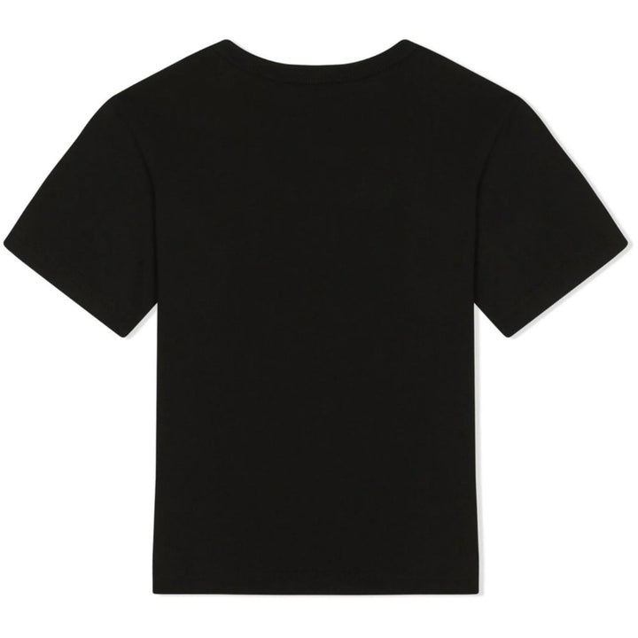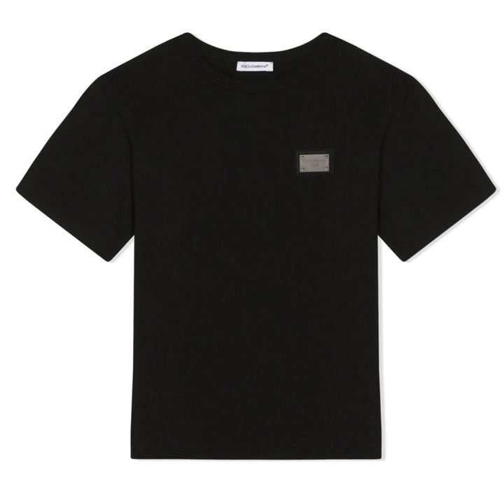 Dolce & Gabbana Kids cotton T-shirt featuring a rectangular logo plaque on the chest and short sleeves. Made in Italy from 100% cotton.