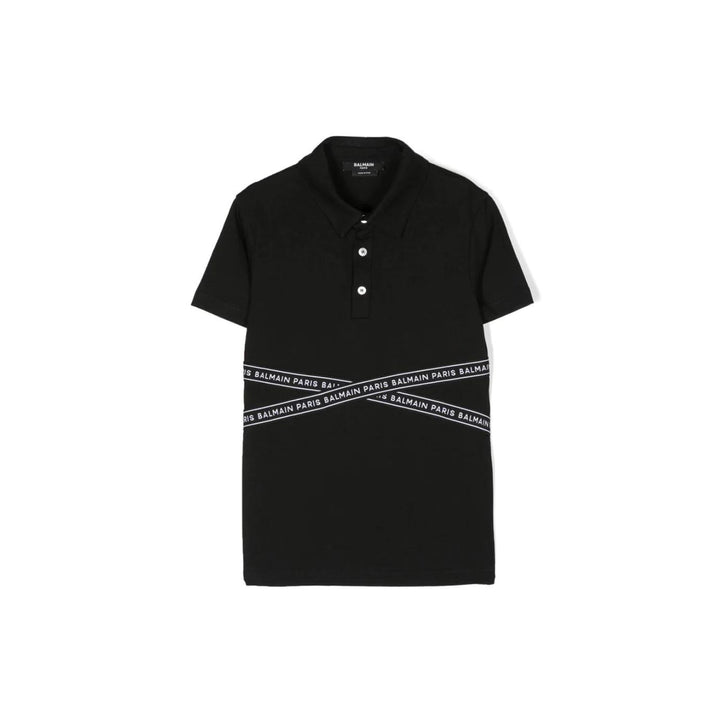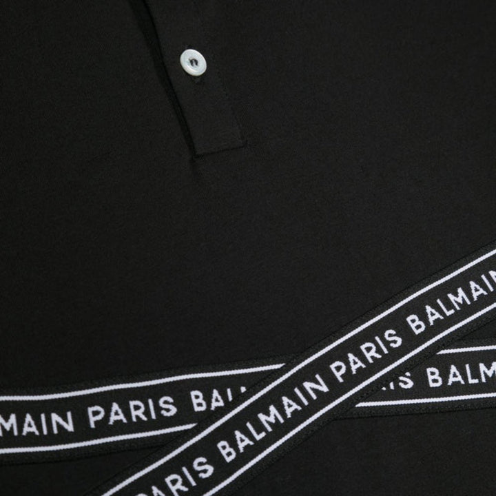 From luxury French label Balmain, a cool and casual Black cotton jersey polo T-shirt for boys. A contemporary take on a classic style, the front has two cross-over black and white elasticated logo tapes for a bold designer statement look. It fastens