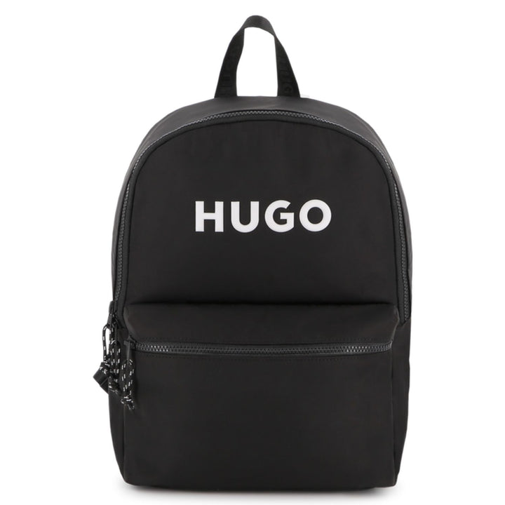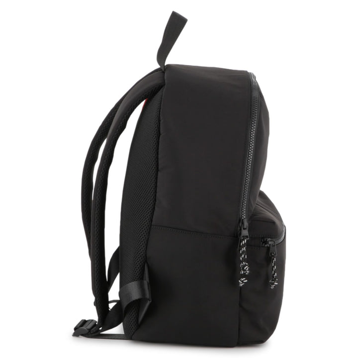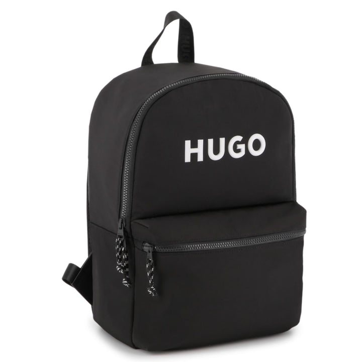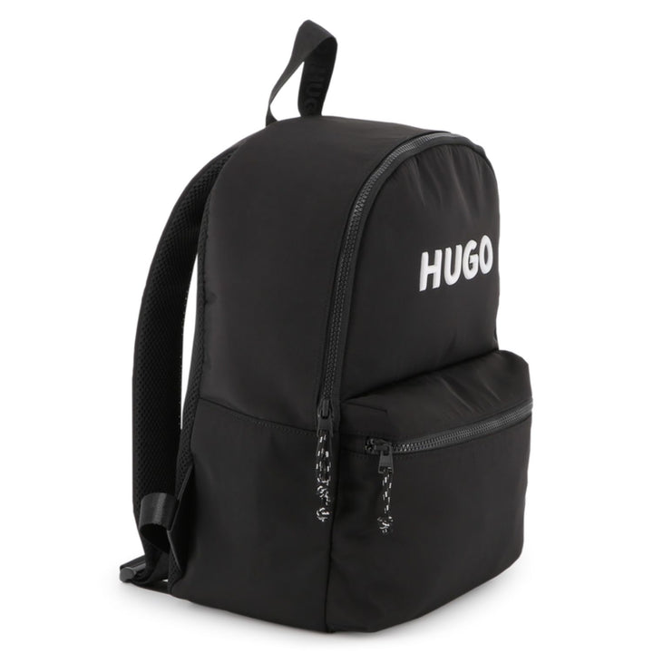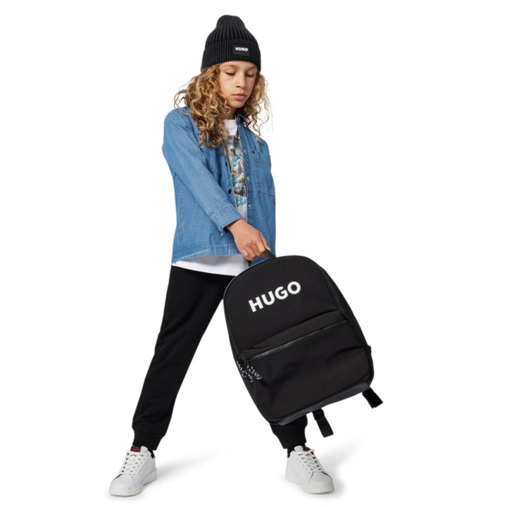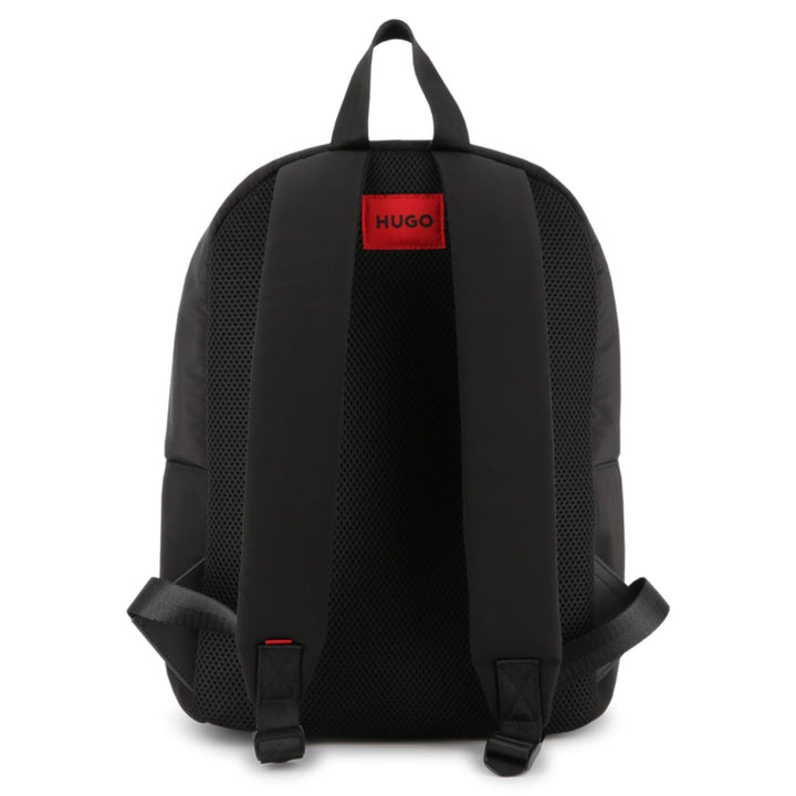 Boys black logo-print backpack by HUGO sleek design featuring the bold red HUGO logo, crafted from durable material with adjustable straps and spacious compartments for everyday use.