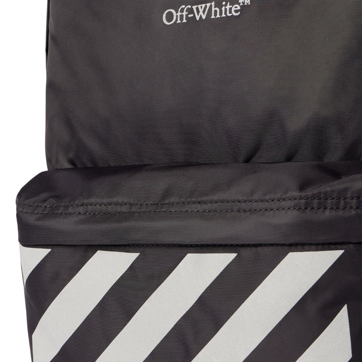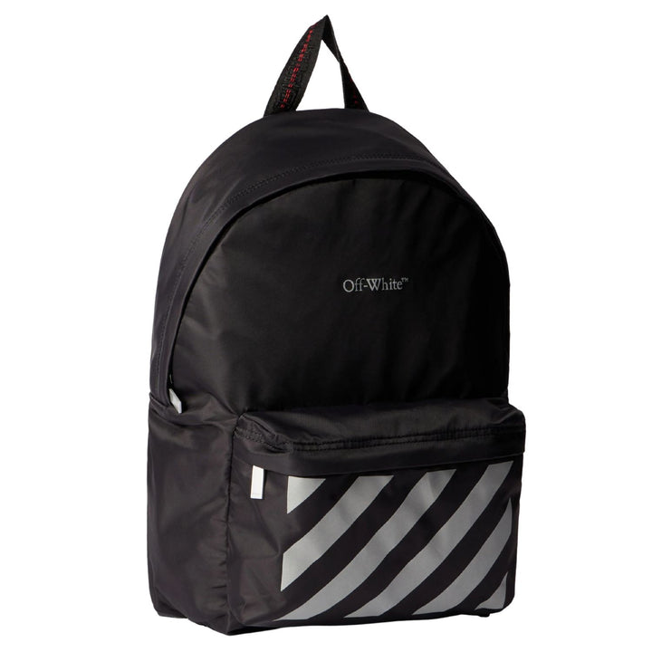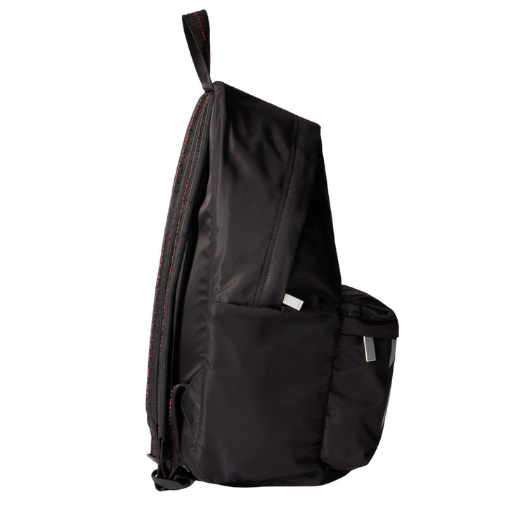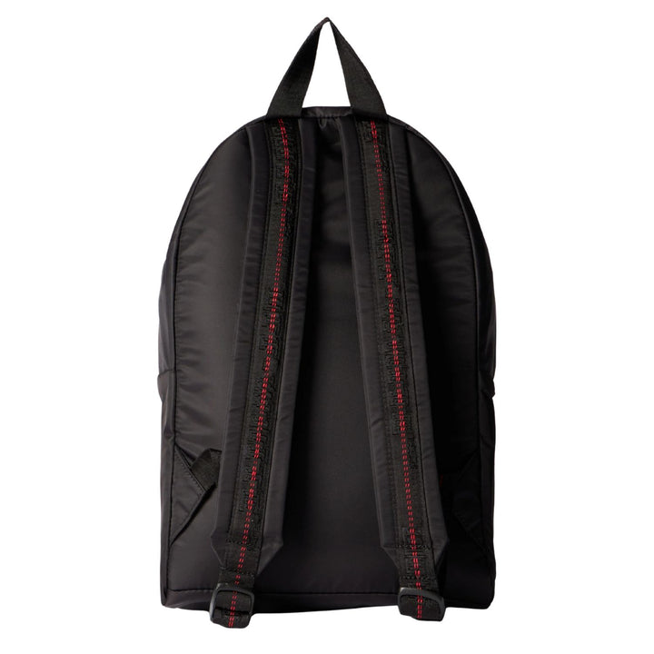 Boys black logo-print backpack designed with a sleek, modern look. Featuring bold logo lettering and signature diagonal stripe detailing on the front pocket, it adds a stylish edge to everyday accessories. Crafted from durable fabric, it offers ample space for essentials and comfortable adjustable shoulder straps for easy carrying. Perfect for school, travel, or casual outings.