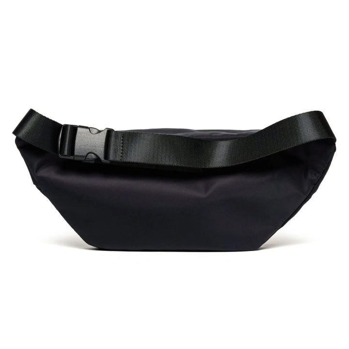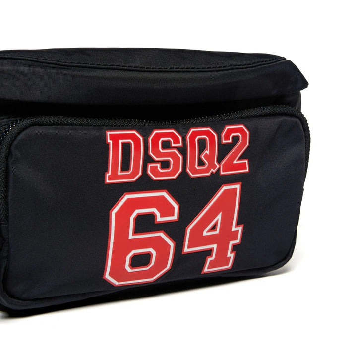 This is a black Dsquared2 belt bag with a bold, sporty design. The front features DSQ2 in large red and white varsity-style lettering, along with the number 64, giving it a collegiate aesthetic. It is made of a durable, water-resistant material, likely nylon or polyester, ensuring longevity and practicality.