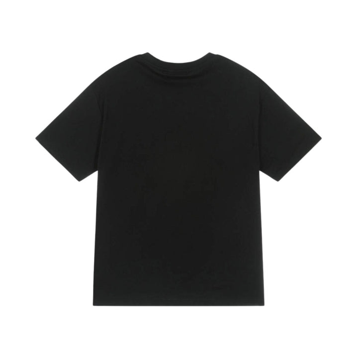 Black T-shirt for boys by Italian brand MSGM, with a white micro logo and a white spray paint effect logo printed on the front, for instant designer appeal. Made in soft, comfortable cotton jersey, this casual tee has short sleeves and a classic ribbed crew neck.