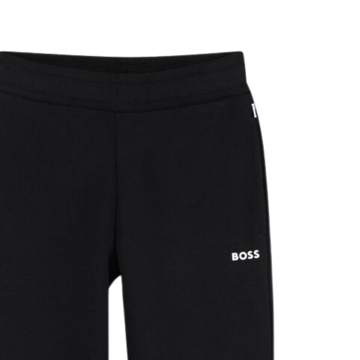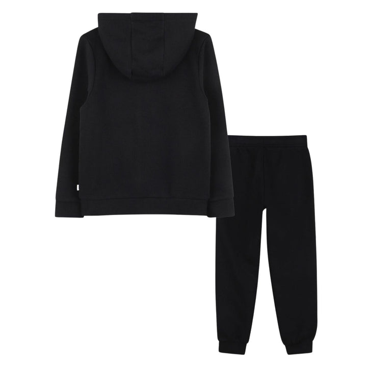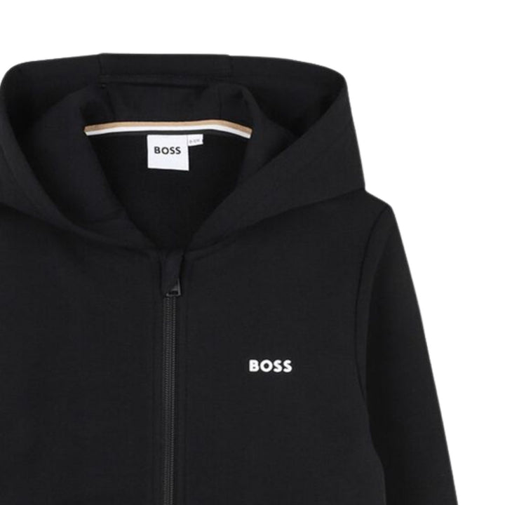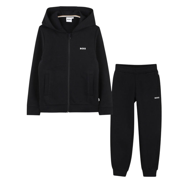 Black tracksuit for boys by BOSS. Made form soft cotton, the hooded zip up top has a front pocket. Matching joggers with two pocket styling and finished with an elasticated waist and drawstring. Both have the brands logo print in white.