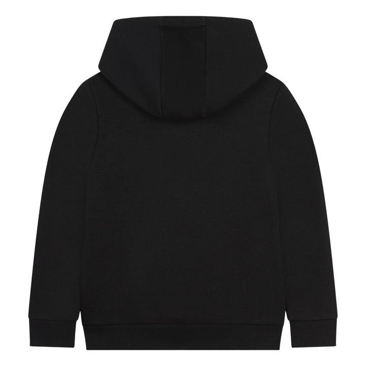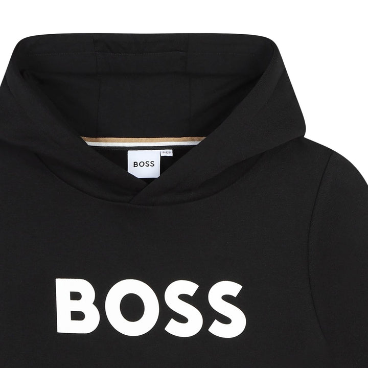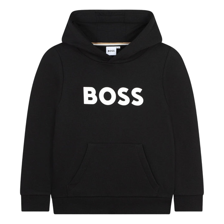 This black hooded sweatshirt from BOSS features the iconic BOSS logo printed boldly across the chest in white. The design includes a classic kangaroo pocket, ribbed cuffs and hem, and a relaxed fit, making it ideal for casual comfort and everyday lay