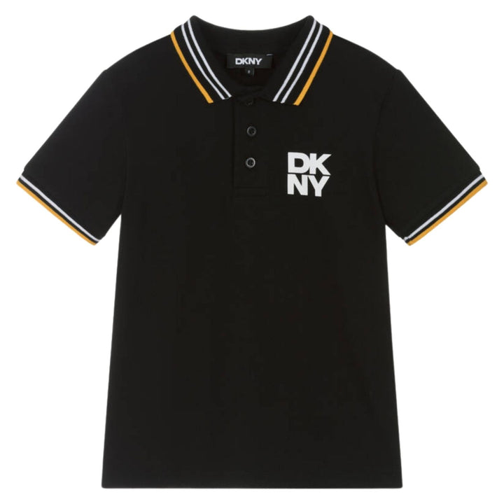 Boys black logo-print polo T-shirt by DKNY a timeless wardrobe essential crafted from premium cotton pique, featuring a classic collar, short sleeves, and bold DKNY logo detailing on the chest. Designed for comfort and a sleek, sporty look that transitions effortlessly from casual outings to smart occasions.