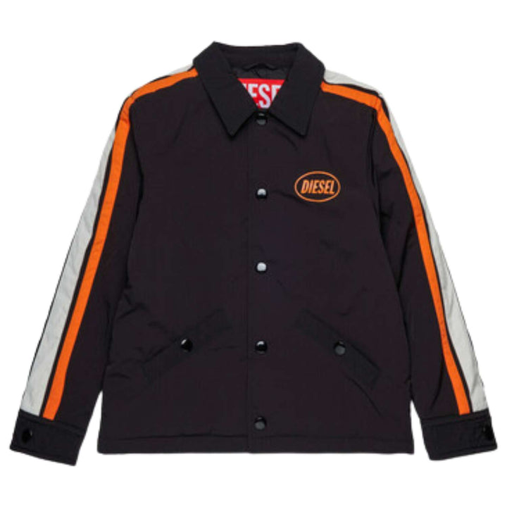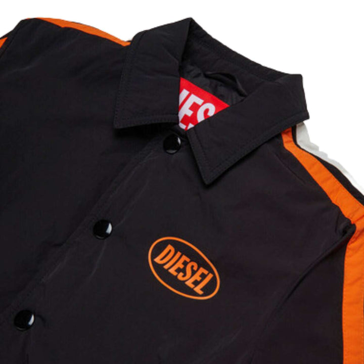 Diesel boys black puffer jacket featuring a bold logo print. Crafted from 1% nylon for a durable, weather-resistant finish. A warm and stylish outer layer for cold days.