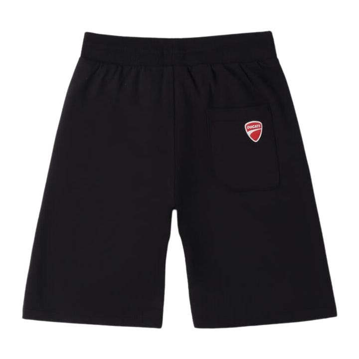 Black Ducati kids shorts featuring side pockets, ribbed waistband with drawstring, and a sleek logo Print and sporty.