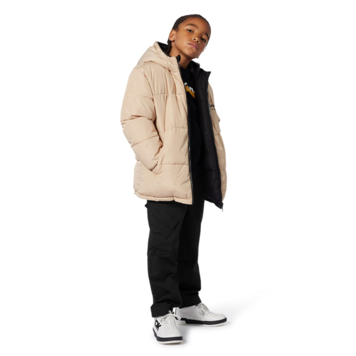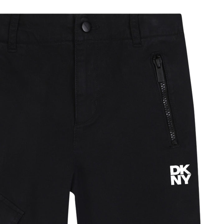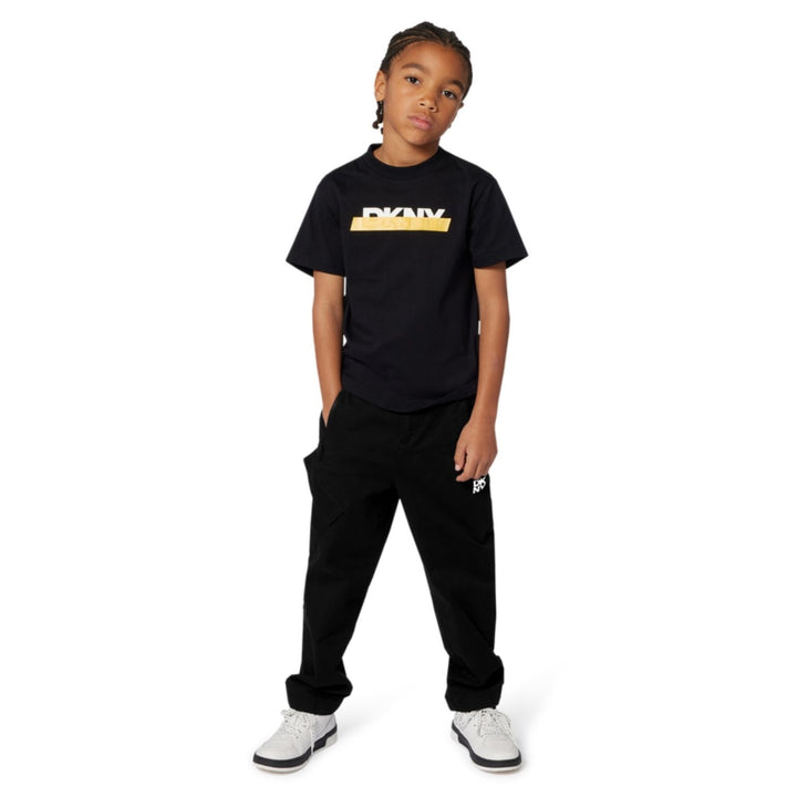 Boys black logo-print trousers by DKNY crafted from premium cotton-blend fabric with a soft brushed interior, featuring a bold DKNY logo print along the leg, ribbed cuffs, and an elasticated waistband for ultimate comfort and modern urban flair.