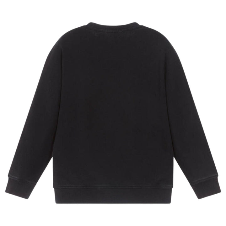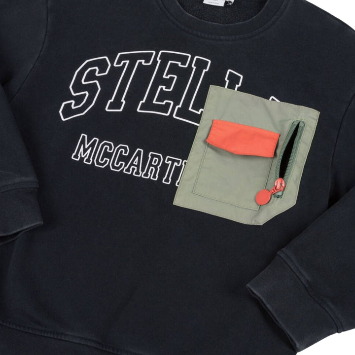 Casual black sweatshirt for boys by Stella McCartney Kids, made in a soft organic cotton-blend jersey. The front features a bold white varsity-style logo and a khaki green utility pocket with contrasting orange details. In a cosy and comfortable rela