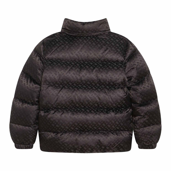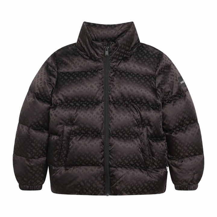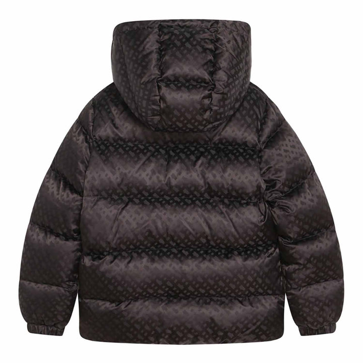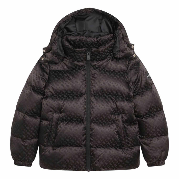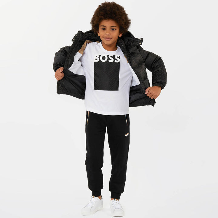Mini-me silky smooth black puffer jacket for boys by BOSS, with a detachable hood. Lined in the brand's signature tricolours, this stylish jacket is padded in soft down for warmth, with elasticated cuffs and hem to help keep out chilly winds and fron