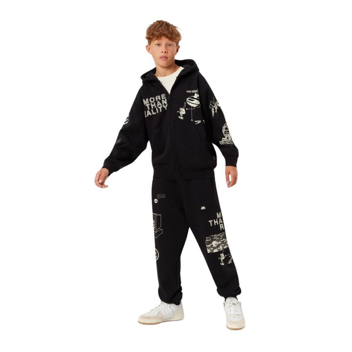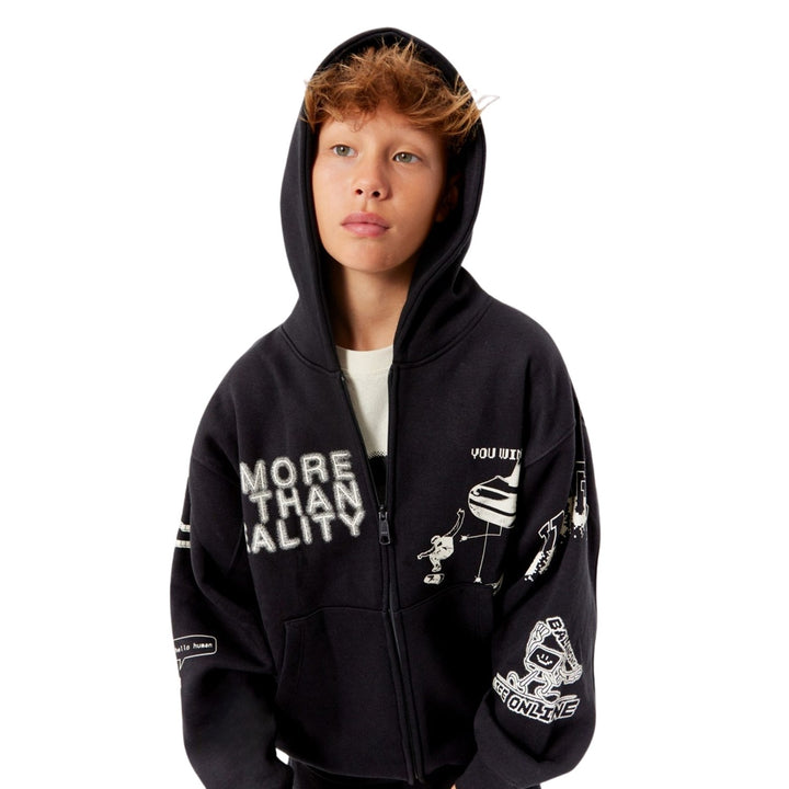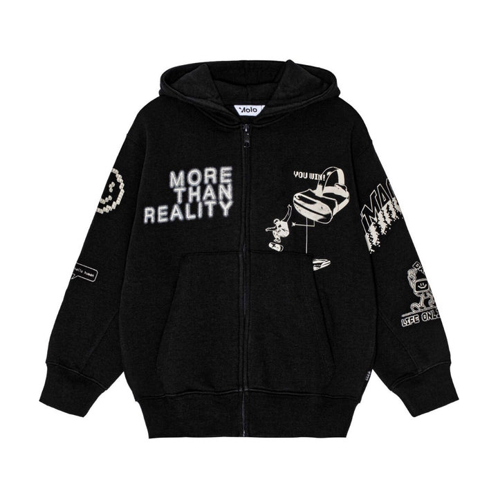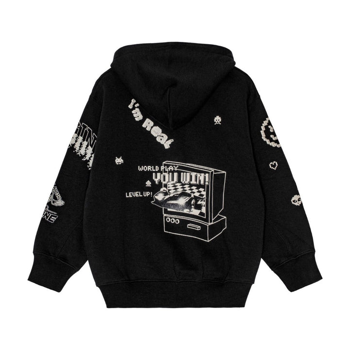 Black and white hoodie in organic cotton with a zip, hood, pouch pocket, and ribbed cuffs and hem. The hoodie has a loose fit and an all-over print. The print is inspired by elements from video games and the virtual world, with white on black