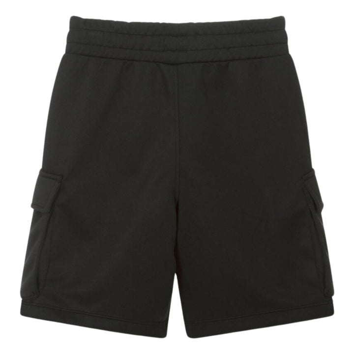 Sporty black shorts for boys by DKNY, made in soft, double pique jersey. This casual style has a comfortable elasticated waistband and slanted front pockets. There are cargo-style pockets on each leg, one of which features a rubberised white logo for a distinctive designer finish.