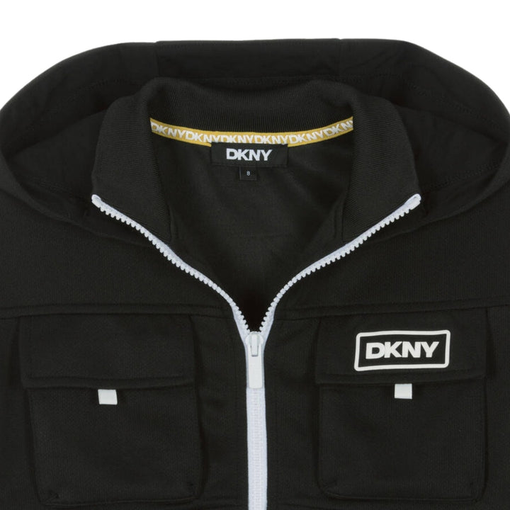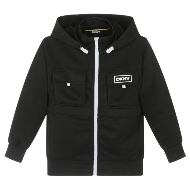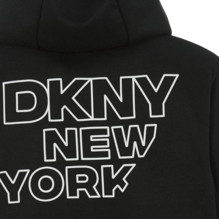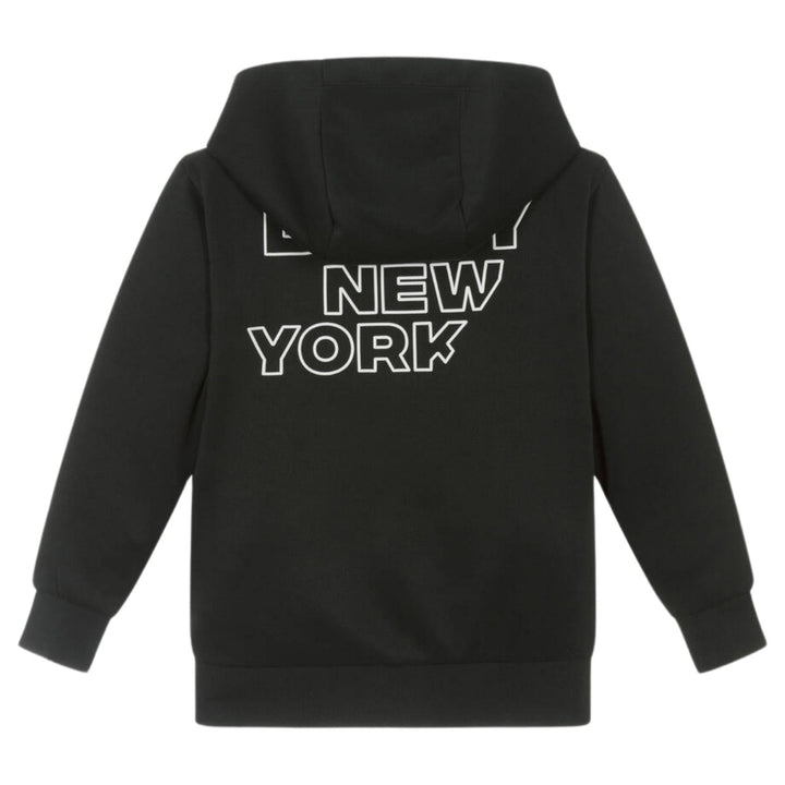 A black zip-up hoodie for boys and girls by DKNY, made in soft, double pique jersey. Unmistakably designer, there is a contrasting white logo design on the back, with further branding on one of the chest pockets. Both stylish and comfortable, it has a sporty, stand-up collar, exposed zip fastening and concealed side seam pockets.