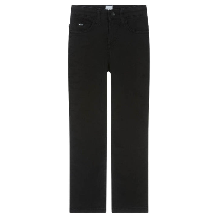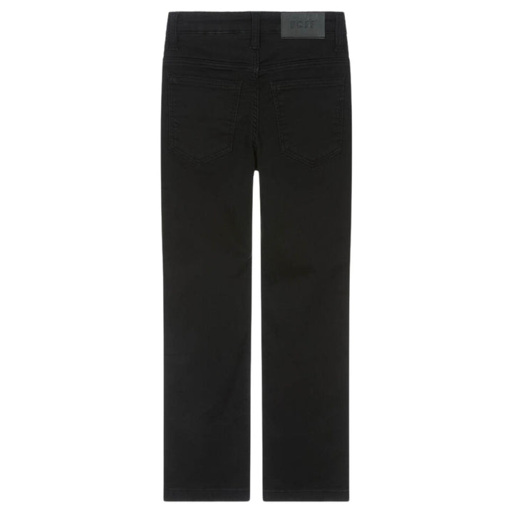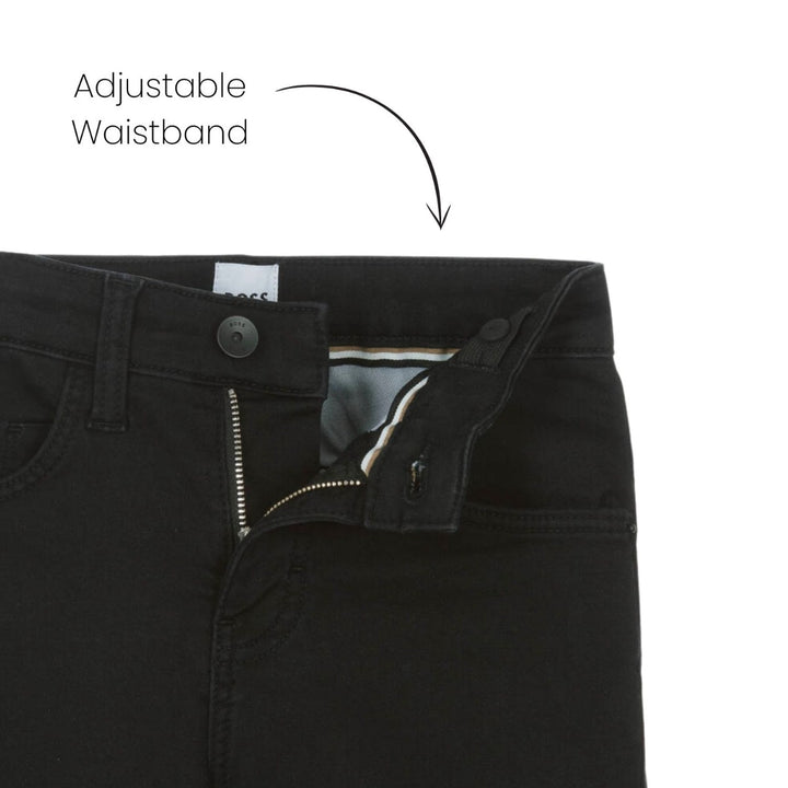 Black regular-fit jeans for boys by BOSS, designed in a five-pocket styling. The denim is made from a soft blend of cotton and viscose with comfortable stretch. Logo-branded, monochrome hardware and jacron give them a sleek and modern look. They have an adjustable waistband for a good fit and fasten with button and zip .