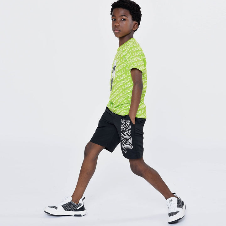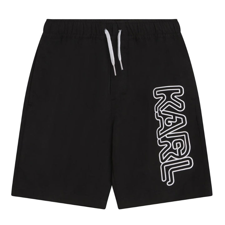 Black logo shorts for boys and girls by Karl Lagerfeld. Made from soft viscose, it features the brands logo print on the front with elasticated waistband for comfortable fit.