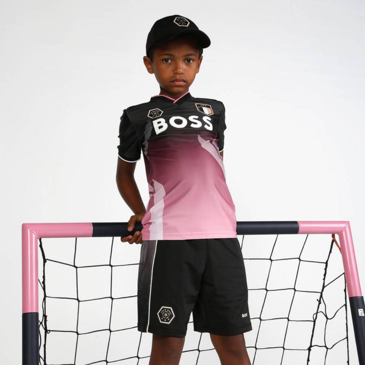 Black football shorts for boys by BOSS, with graduated black and pink dotted trims on the sides. Silky smooth and stretchy, with concealed side seam pockets and an internal drawstring on the elasticated waistband, they offer a sleek look with added style and are designed with comfort in mind. They feature a white logo print on one leg and a football-themed Team Boss badge on the other leg in the brand's signature beige, black and white colours.