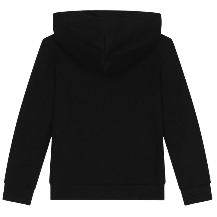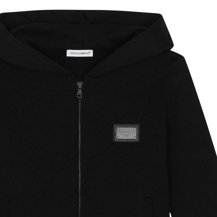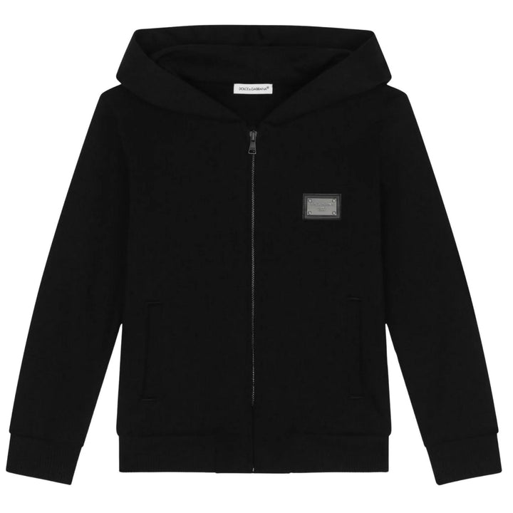 Boys black zip-up logo-patch hoodie by Dolce & Gabbana crafted from soft cotton with a front zip closure, featuring the signature DG logo patch on the chest and ribbed trims for a sleek, modern look.