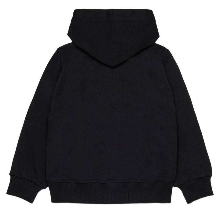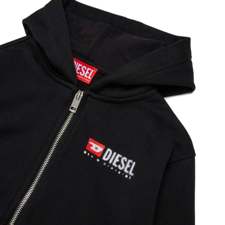 Diesel boys black zip-up hoodie with bold logo print. Made from a soft blend of 90% cotton and 10% polyester, with ribbed trims (97% cotton, 3% elastane) for added comfort and flexibility. A stylish layer for everyday wear.
