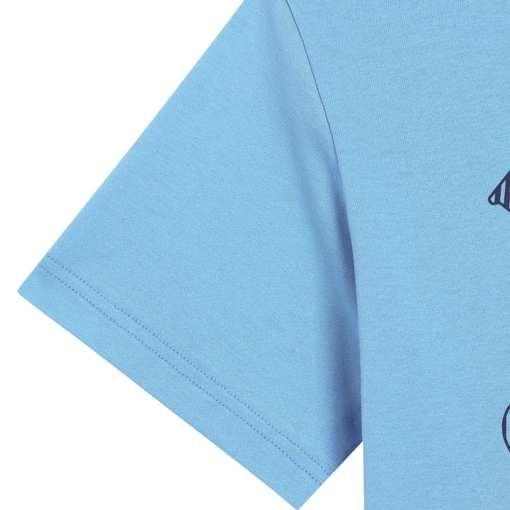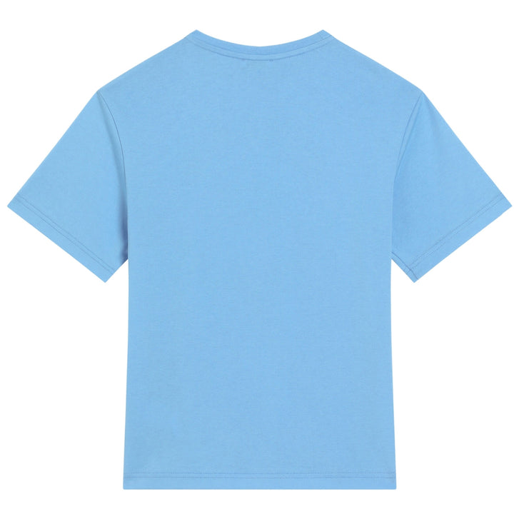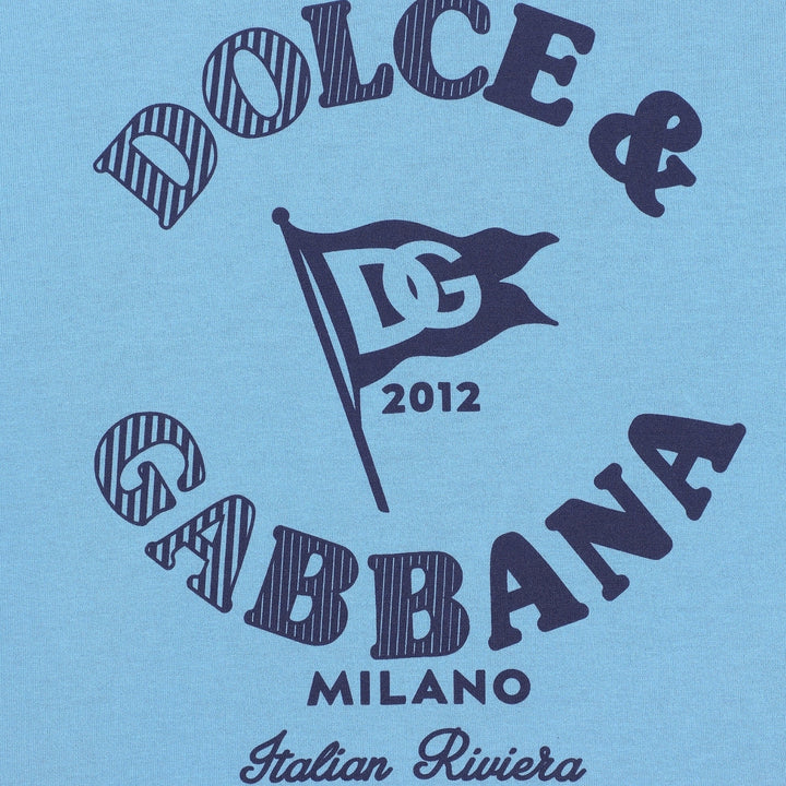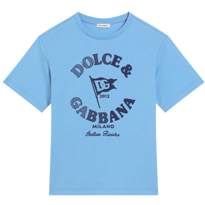 Blue T-shirt for boys by luxury Italian brand Dolce & Gabbana, made in soft cotton jersey. This short-sleeved T-shirt features a cool blue flag logo printed on the front. The classic design and comfortable fit make this casual tee a fun wardrobe esse