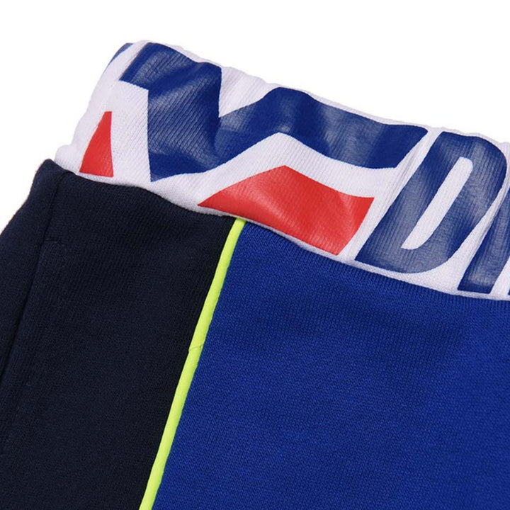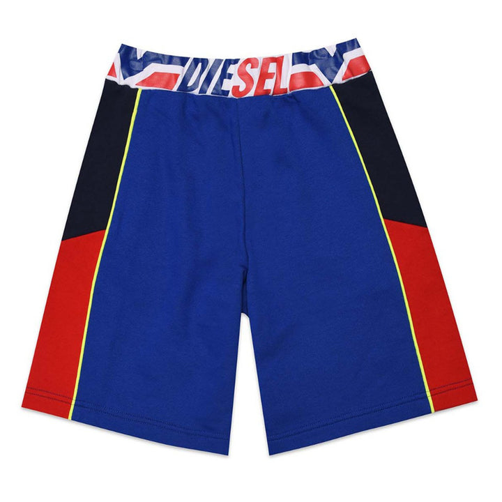 Boys blue, black and red colourblock shorts by Diesel, made in mid-weight cotton jersey. Forming part of the designer's sports capsule, they have side pockets and light reflective grey piped trims. There are red and blue logo prints on the elasticate