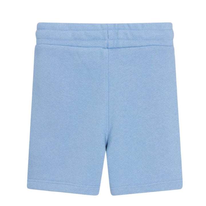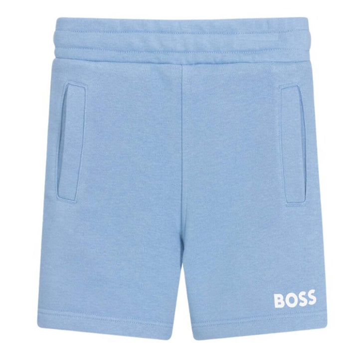 Casual blue shorts for boys by BOSS, made in soft cotton blend jersey. Great for laidback days, these simply styled shorts have a rubberised white logo print on one leg and hand pockets on the sides. The internal drawstring waist promises comfortable