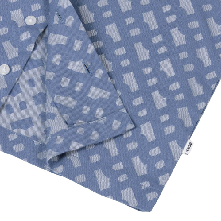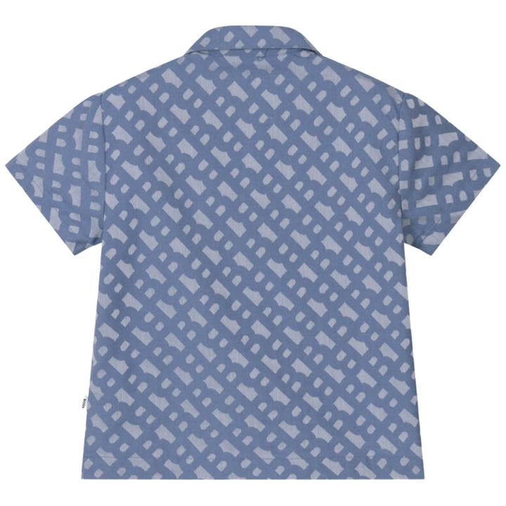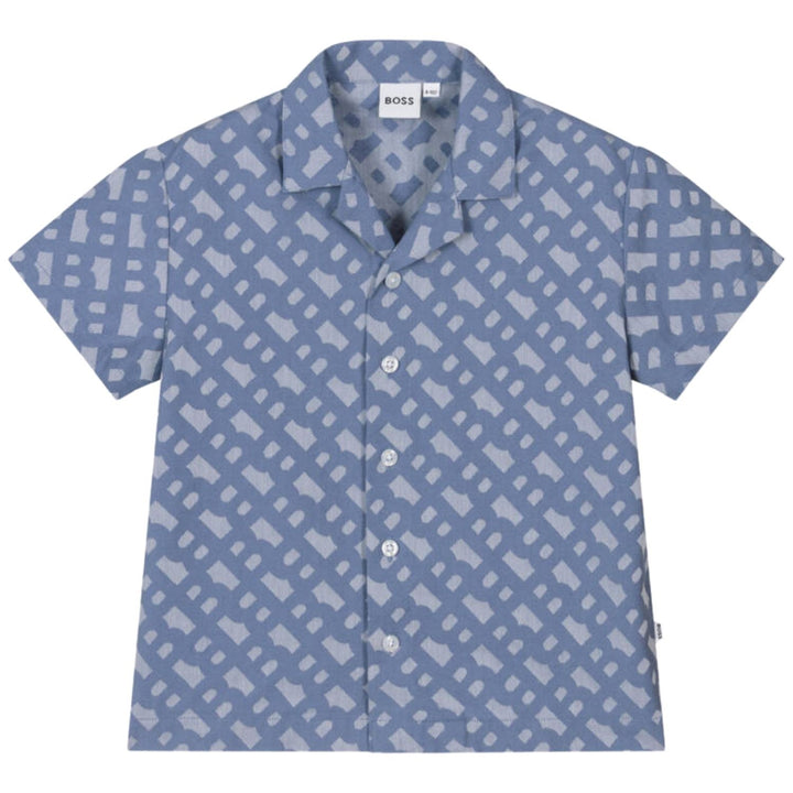 A blue shirt for boys by BOSS, woven in lightweight cotton twill, with a jacquard monogram design. Casually styled with a revere collar, this cool shirt fastens neatly with branded buttons for an extra designer touch.