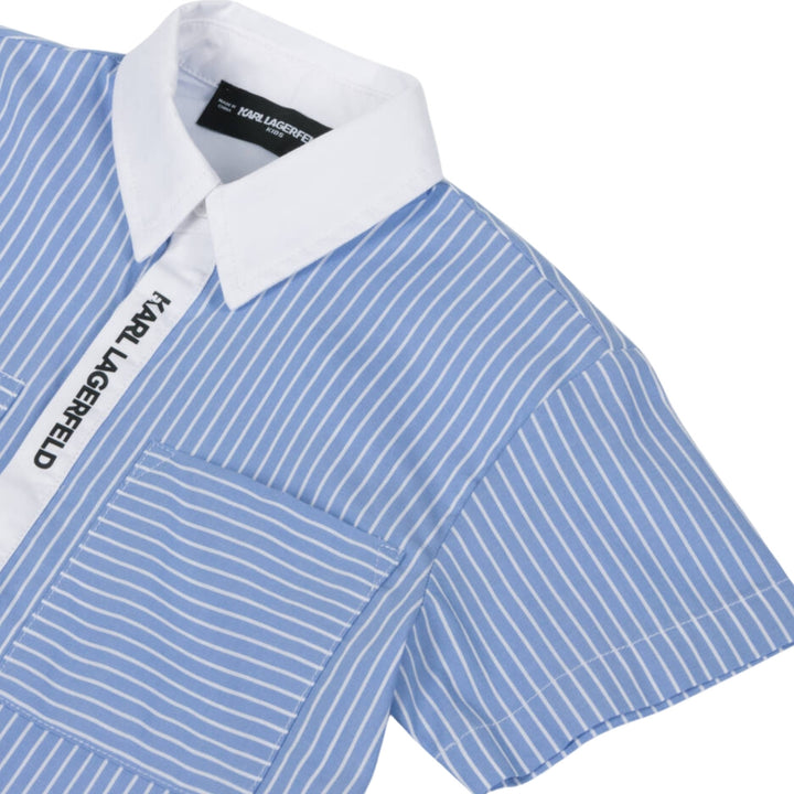 Stylish blue and white striped shirt for boys by KARL LAGERFELD KIDS, printed with a distinctive black logo. Made in soft cotton, this smart style has a white pointed collar, chest patch pockets and concealed button fastenings. A branded tab is sewn