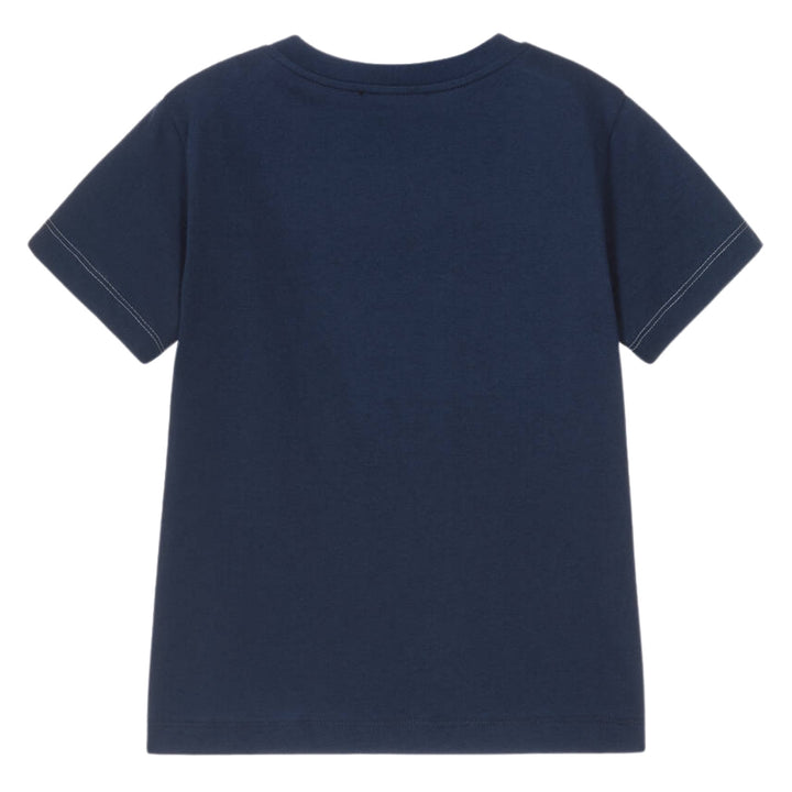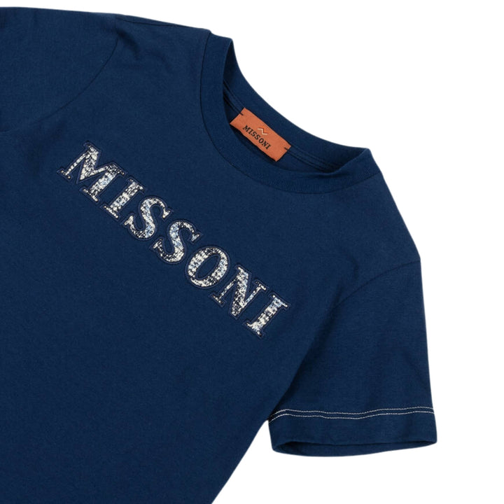 Boys navy blue cotton T-shirt undeniably by Missoni, with a bold tweed logo emblazoned across the front in shades of blue. It is made in soft, comfortable jersey with white overstitching on the sleeves.