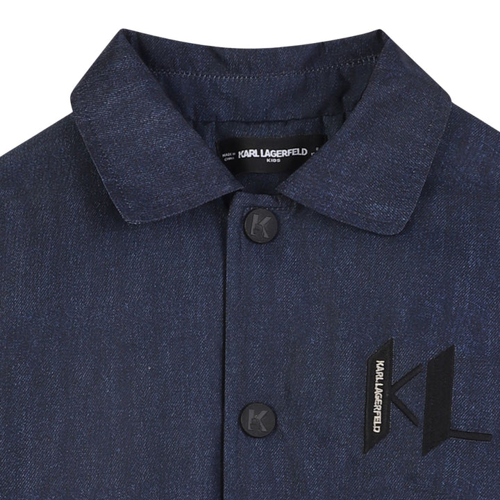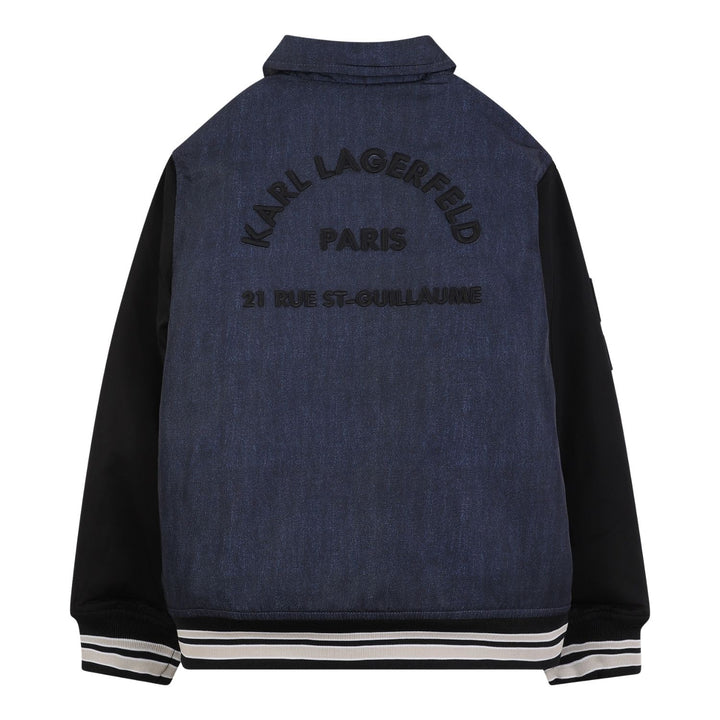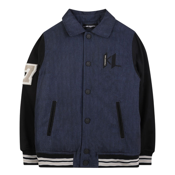 Trendy blue denim bomber jacket for boys by Karl Lagerfeld, featuring a sleek logo detail and modern streetwear appeal.