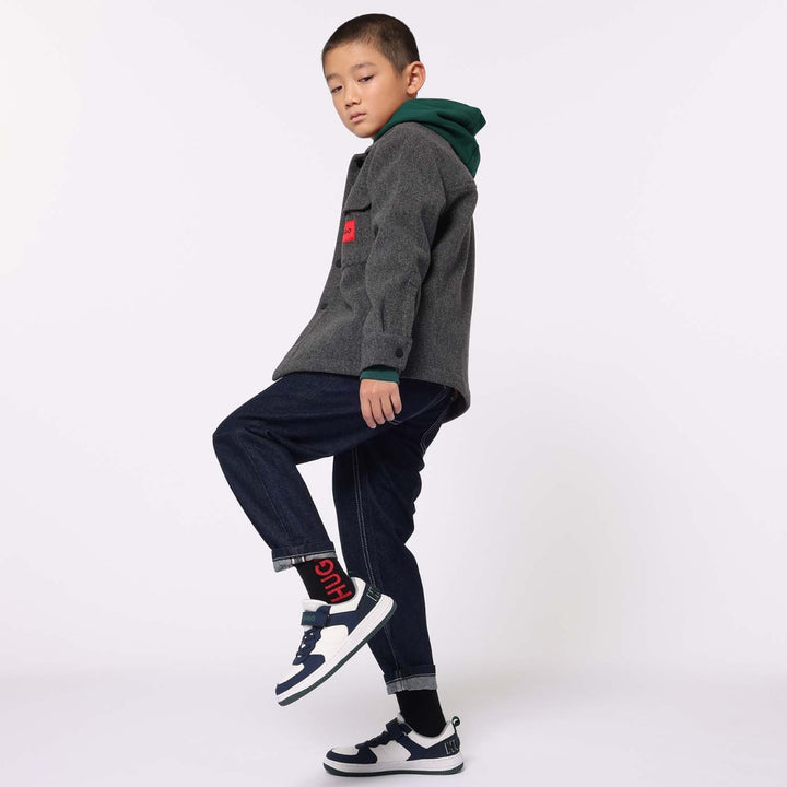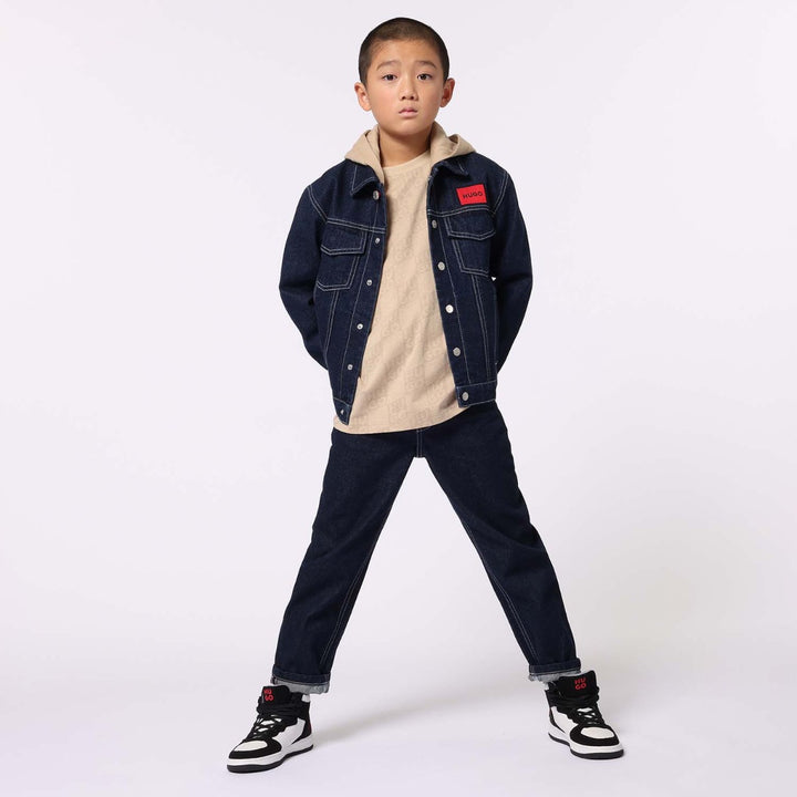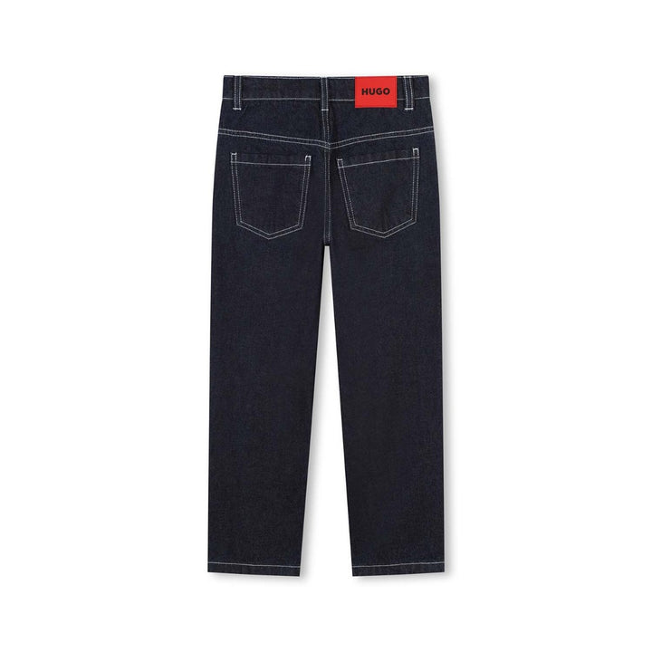 Dark blue loose fitting jeans for boys by HUGO, made in non-stretch denim. With classic five-pocket styling, they have stand-out contrast white stitching for an updated look. They fasten with a button and zip and have a useful adjustable waist for a comfortable fit. The HUGO style name is printed inside the back of the waistband in red. There is a black and red logo badge on the back and a red metal logo rivet on the coin pocket.