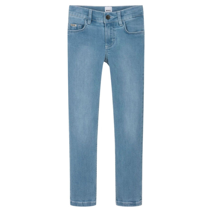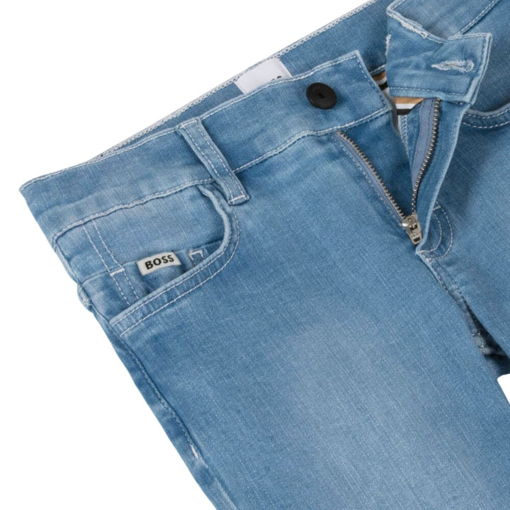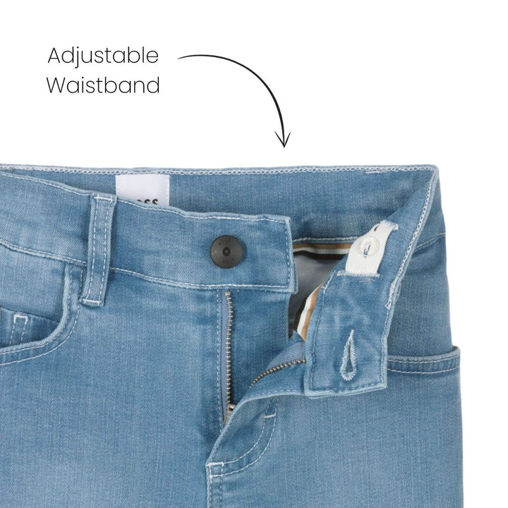 Blue jeans for boys by BOSS, with a washed, worn look and black branded detailing for designer appeal. Made in soft, stretchy denim in a classic five pocket style, they have a slim fit and an adjustable waist on the smaller sizes for comfort.